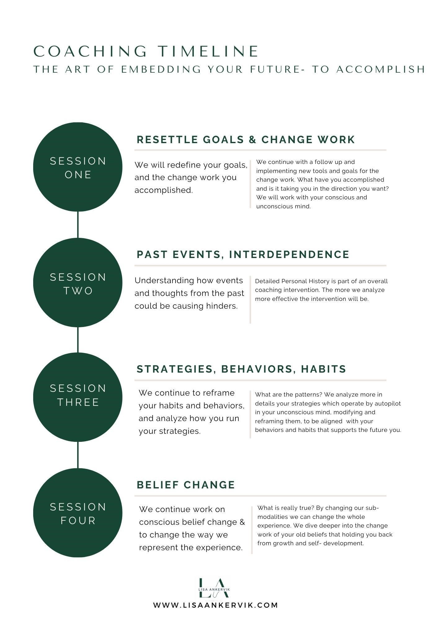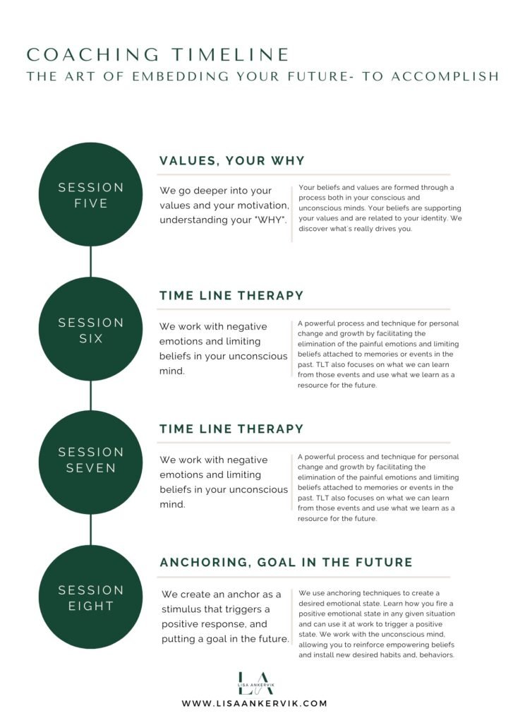 The timeline is created to provide an overview of the coaching sessions that guide you towards embedding your future. It’s important to note that every individual has their own unique experiences and challenges, and as such, the timeline is adaptable to accommodate changes that benefit each client’s specific needs and requests. The program includes pre-work and tasks for each week, which will also be personalized to suit each individual client. The art of embedding your future is a continuation of the “Carving Your New Life” program, aimed at achieving deeper, long-lasting changes within yourself.