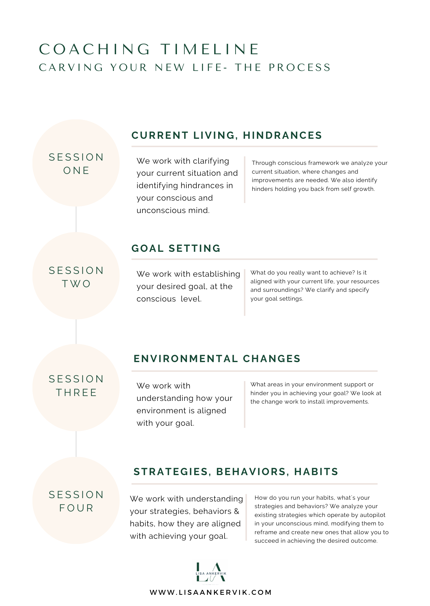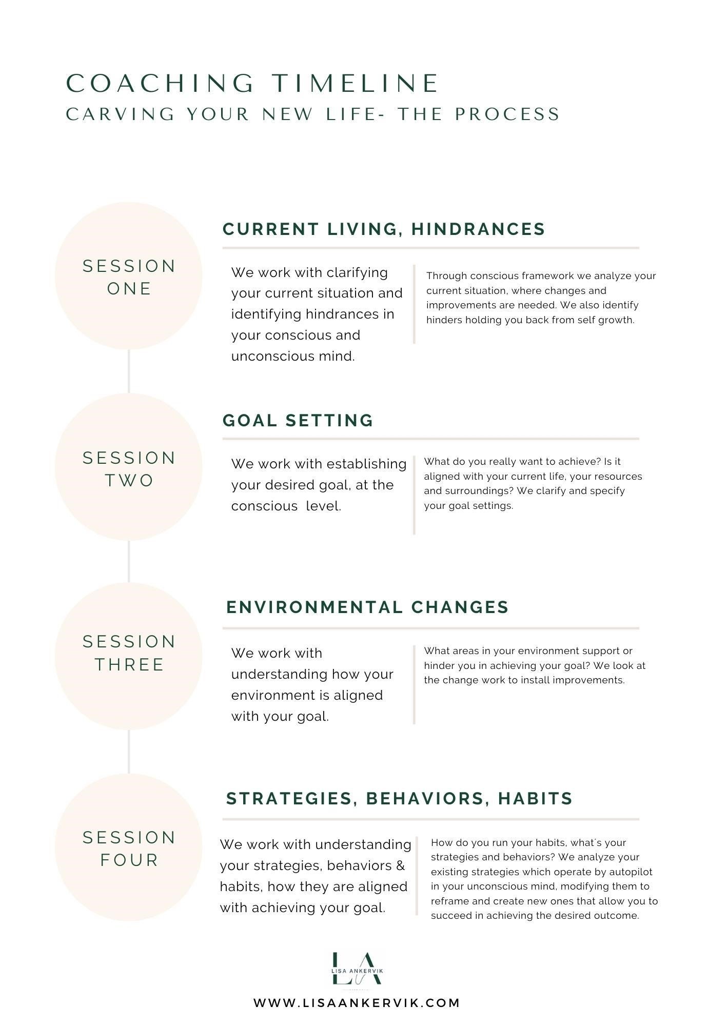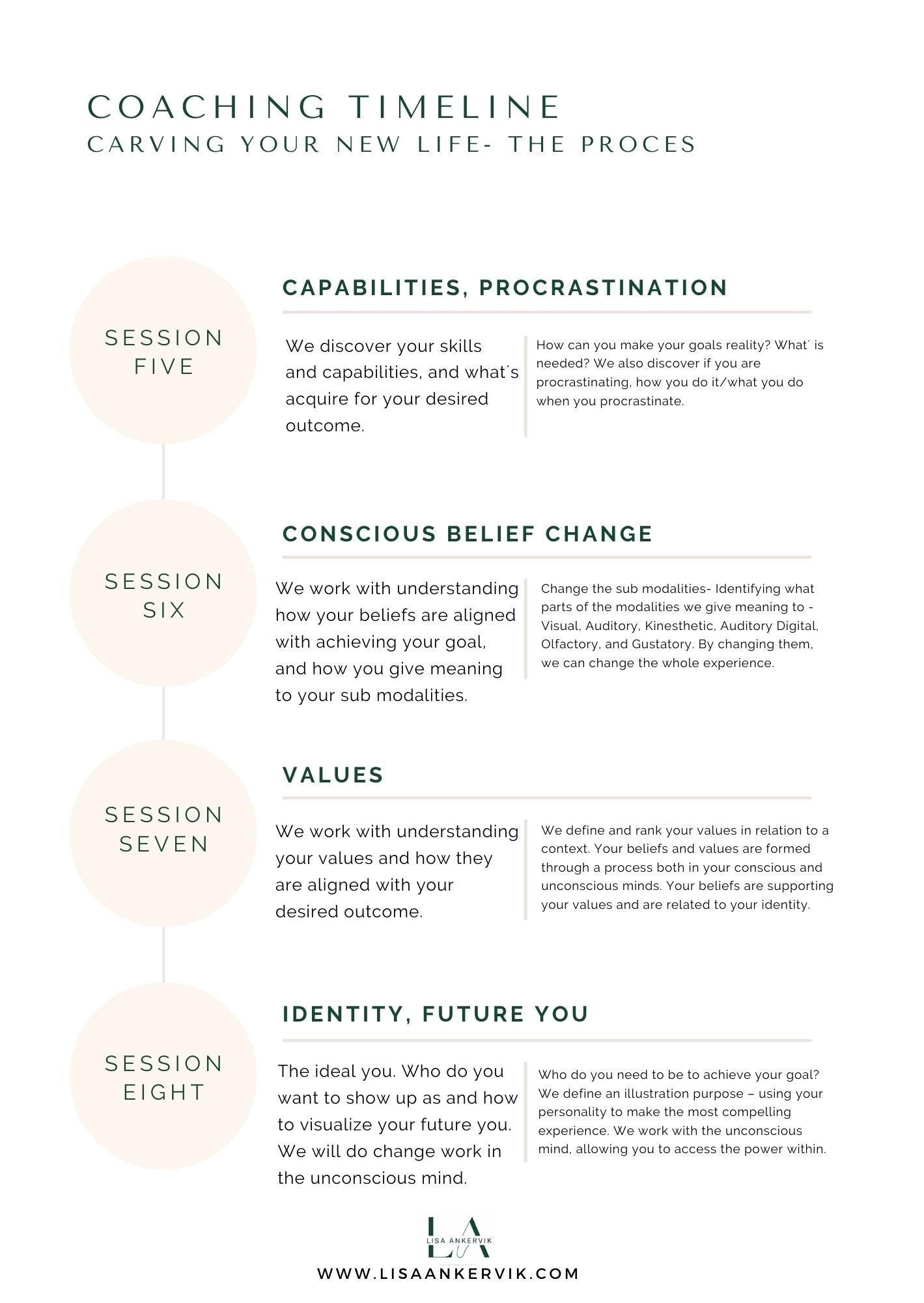 The timeline is designed for you to see an overall structure of our coaching sessions, which lead to the foundation for mapping your future self. Note that every person has their own unique experience and challenges. Therefore, the timeline is adaptable for changes that benefit the clients personal needs and requests. The pre-work and tasks for each week are included in the program and will also be customized for each individual client.